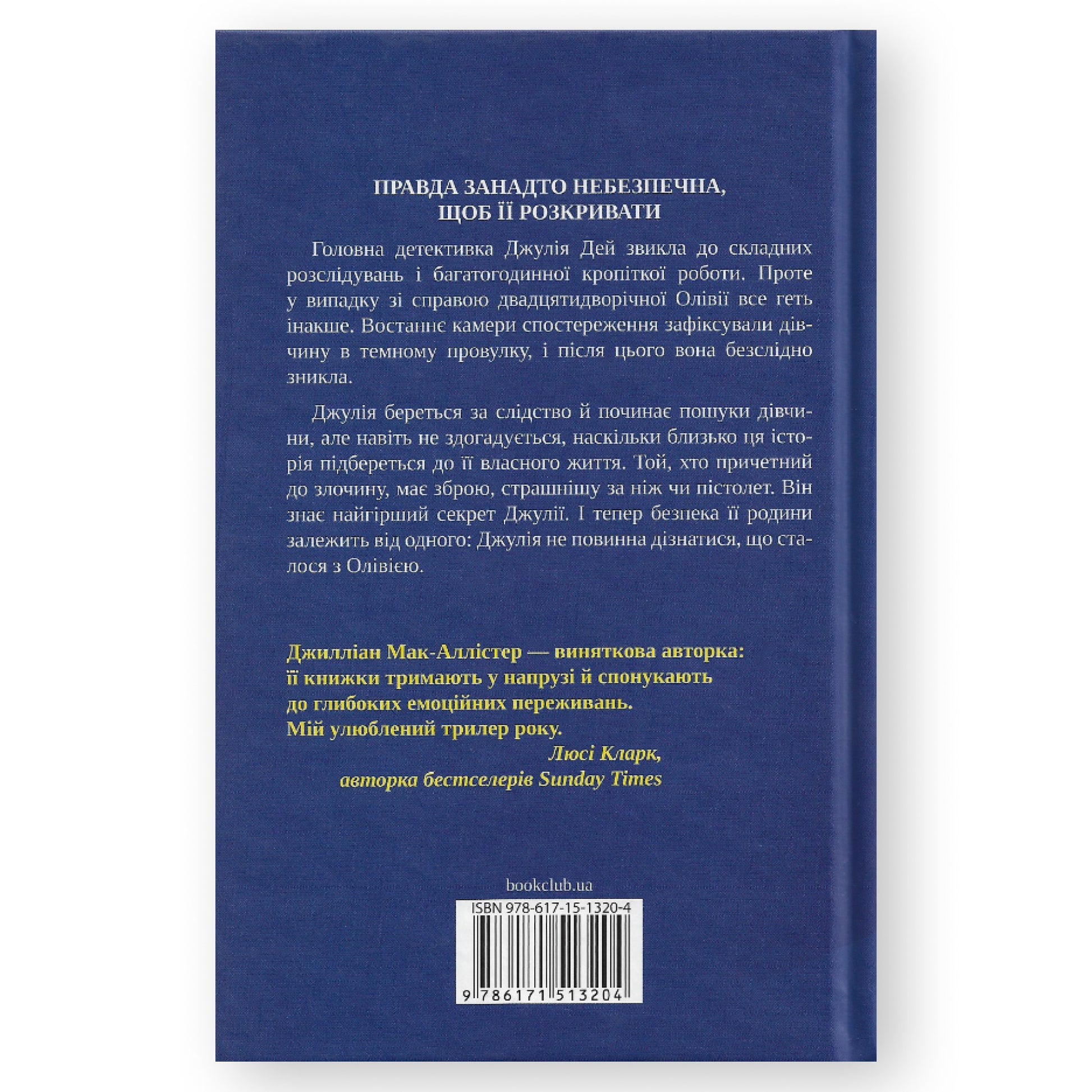 Джулія береться за слідство й починає пошуки дівчини, але навіть не здогадується, наскільки близько ця історія підбереться до її власного життя. Той, хто причетний до злочину, має зброю, страшнішу за ніж чи пістолет. Він знає найгірший секрет Джулії. І тепер безпека її родини залежить від одного: Джулія не повинна дізнатися, що сталося з Олівією. Адже якщо знайде її, то втратить усе.
