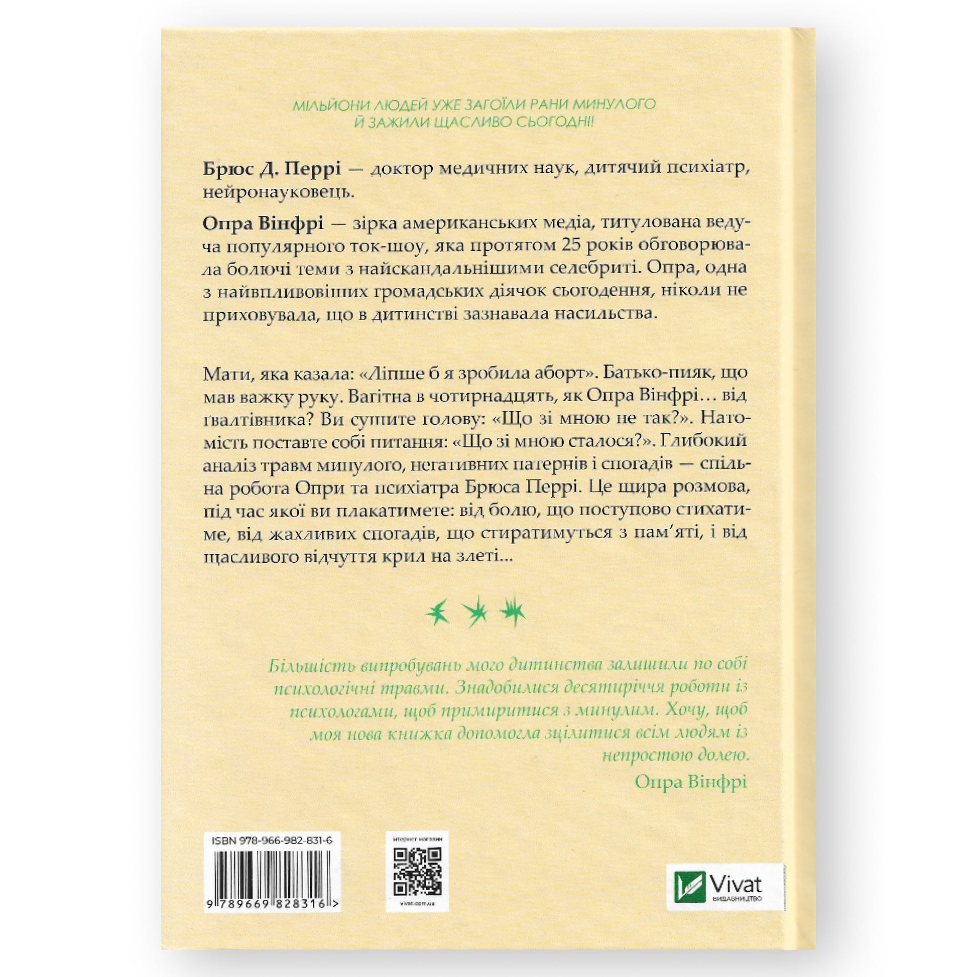 Книга «Що з тобою сталося? Про травму, психологічну стійкість і зцілення» — це корисний нонфікшн Опри Вінфрі й Брюса Перрі про психологічні травми, пошук себе й усвідомлення свого непростого досвіду. Погані вчинки й слова часто змушують шукати недоліків у собі, а фізичний удар від людини або ж ляпас грубим словом назавжди лишаються раною, яка повсякчас стікає кров’ю на серці. Плоди травми вкорінюються настільки, що визначає всі наші стосунки, рішення й поведінку в житті.