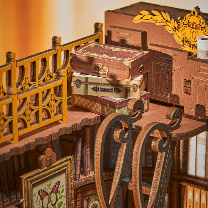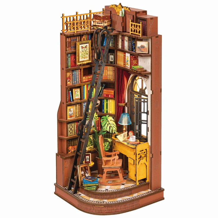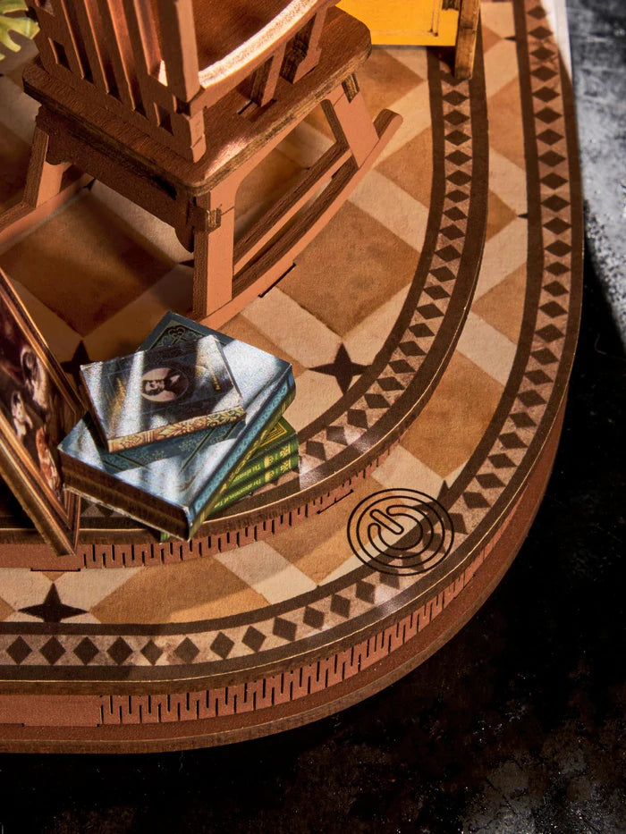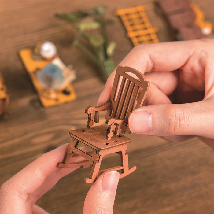 Тут є все: маленький столик із чашкою кави, крісло-гойдалка, стелажі з книжками та навіть двері, що виглядають як справжнє коване мистецтво. Кожен елемент вирізаний лазером із якісного дерева й паперу. Ти складаєш цей простір самостійно — завдяки простій системі з’єднання деталей (snap fit) і додатковим аксесуарам у комплекті.