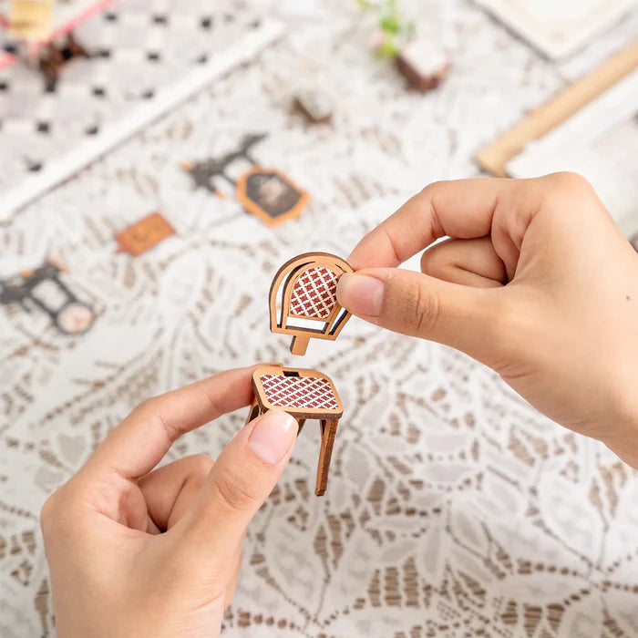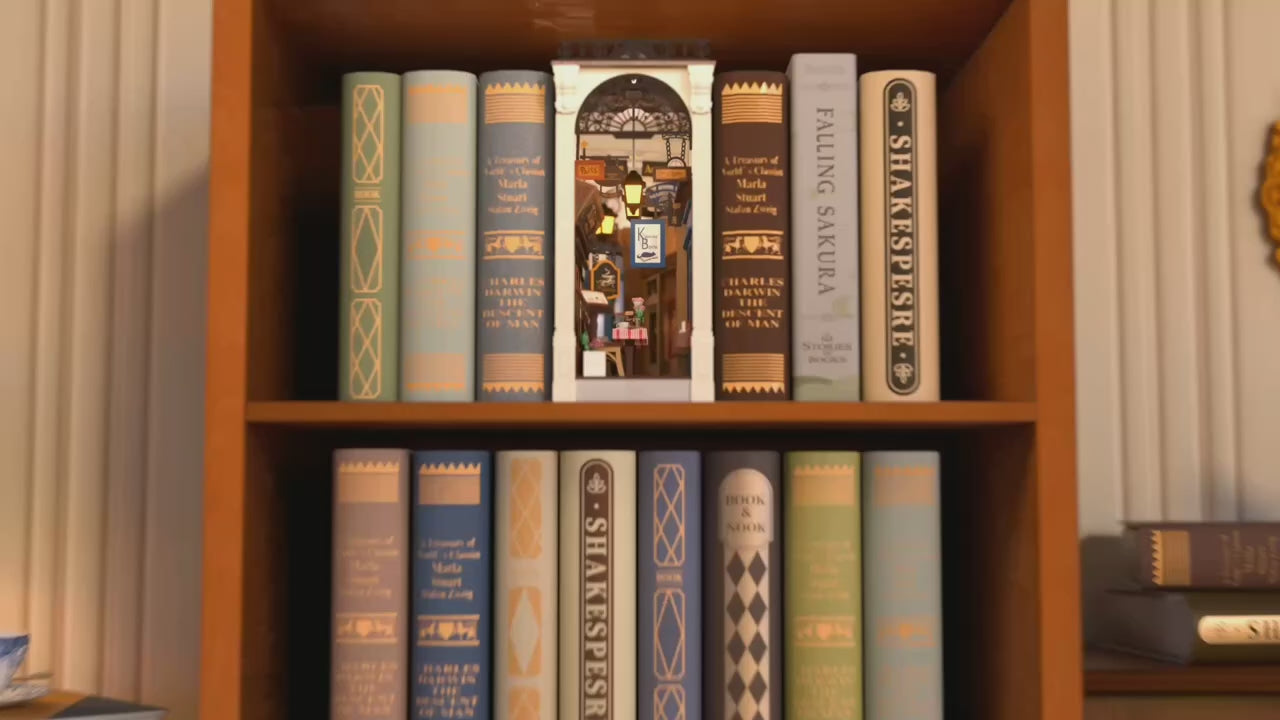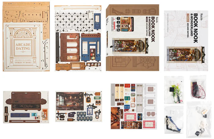 Мініатюра виготовлена з дерева й паперу преміум якості. Усі деталі вже вирізані лазером і пофарбовані, тому складання просте й приємне. Завдяки системі з’єднання без клею (snap fit) елементи легко поєднуються між собою. Готовий book nook має прозорий дах і вмикається дотиком — м’яке LED-світло додає затишку навіть уночі.