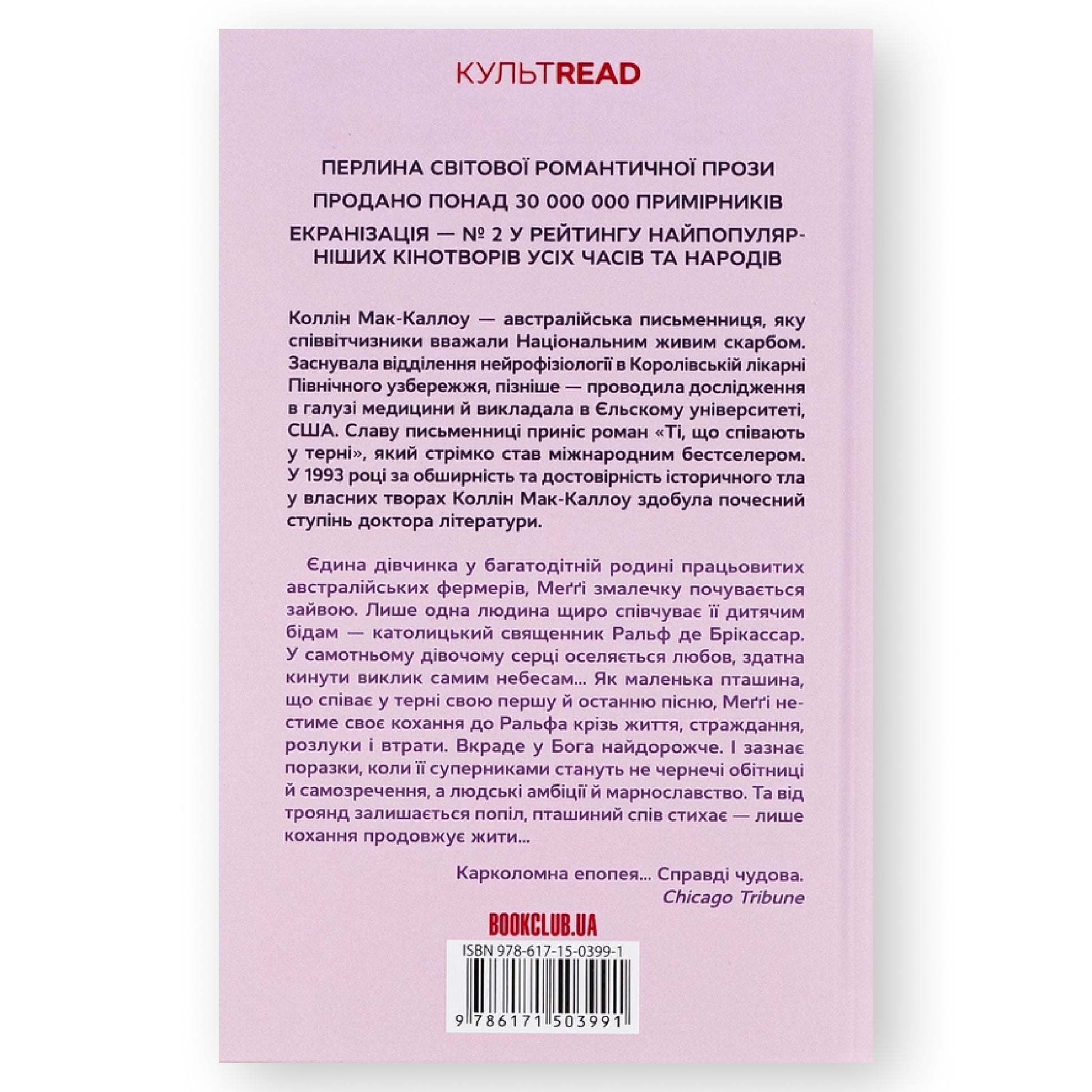 Як маленька пташина, що співає у терні свою першу й останню пісню, Меґґі нестиме своє кохання до Ральфа крізь життя, страждання, розлуки і втрати. Вкраде у Бога найдорожче. І зазнає поразки, коли її суперниками стануть не чернечі обітниці й самозречення, а людські амбіції й марнославство. Та від троянд залишається попіл, пташиний спів стихає - лише кохання продовжує жити…