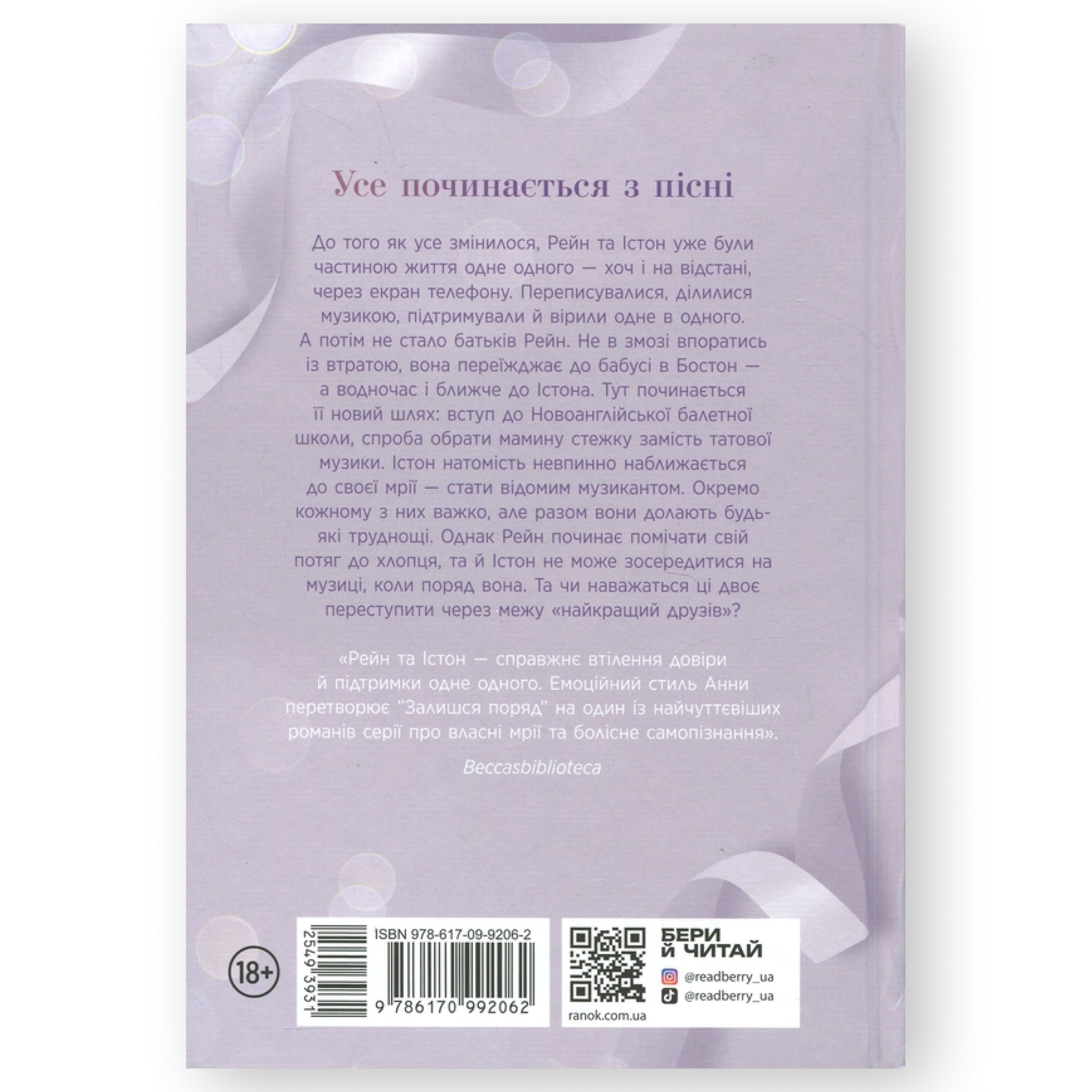 Для Рейн, дочки рок-зірки й балерини, музика завжди була всім, але й танці займали в її серці особливе місце. Проте після автокатастрофи, що забрала обох батьків, дівчина губиться в болю та стоїть на роздоріжжі. З одного боку — музика, її пристрасть. Але голос батька назавжди закарбований у платівках. Від мами ж не залишилося нічого, крім спогадів. Тож Рейн вирішує вступити до Новоанглійської балетної школи — тієї самої, з якої починала карʼєру мама.Новий шлях виявляється непростим, але, на щастя, Істон завжди поруч. Він готовий підтримати її в будь-який момент, тимчасом як сам бореться зі своєю невпевненістю. Він не чекав, що Рейн стане для нього чимось більшим, ніж просто подругою. І ось перед ними постає питання: як зберегти цінну дружбу, коли почуття щодень зростають?